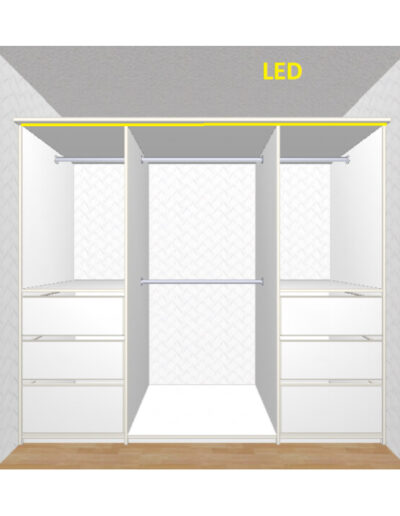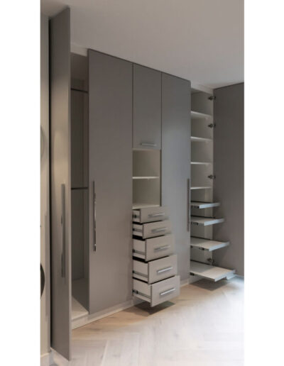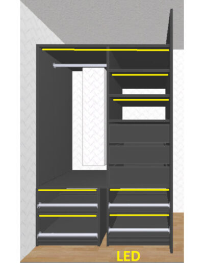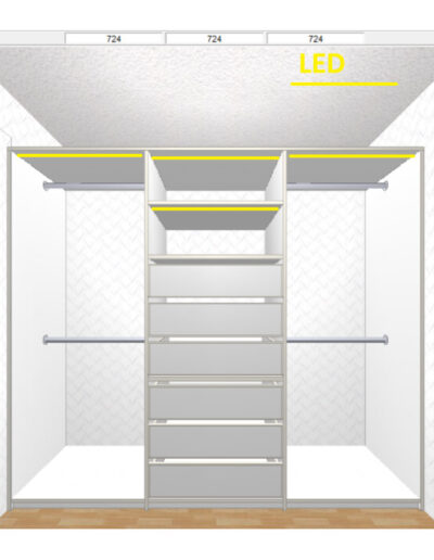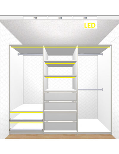 Variant 2: funktsionaalne sisu: 6 väljatõmmatavat riiulit jalatsitele, 6 pehmendustega sahtlit, 4 riiulit ja torud riietele, värv H 3398 st12 – hind 1339 eurot.